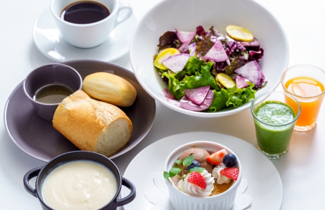 朝食は、ガーナブラックチョコをふんだんに活用した特製ビーフカレーなどロッテならではのメニュー、また、美肌効果が期待できるオリジナルメニュー「豆腐のおからパプリカソース」は、地元すみだの豆腐店の手作り豆腐に生ハムとアボガドを添え見た目にも華やかなメニュー、また小松菜などを使用したグリーンスムージーは、食材の新鮮さをそのままお届けしたいという思いを表現いたしました。