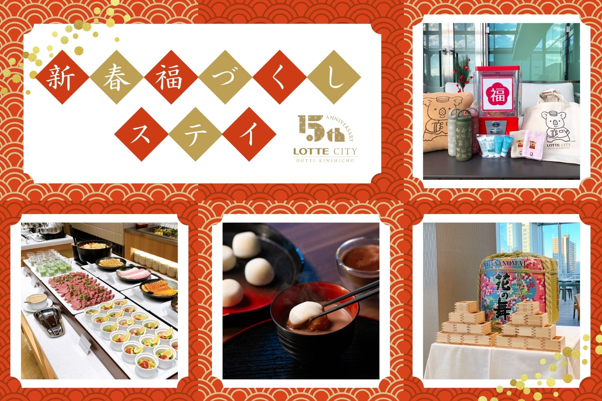 2025年から2026年の年越しをホテルで 「福いっぱい!新春福づくしステイ」 宿泊プラン 2025年12月31日「年越しそば」をご提供 2026年1月1日「お餅つき大会」「振る舞い酒」「雪見チョしるこ」をご提供 2026年1月1日・1月2日「新春特別朝食ビュッフェ」付き 2025年12月31日ご宿泊のお客さまは「福福カプセルトイ」付き ※2025年12月31日 ご予約はこちらから https://go-lottecityhotel.reservation.jp/ja/plans/10175447?adults=2 ※2026年1月1日 ご予約はこちらから https://go-lottecityhotel.reservation.jp/ja/plans/10175449?adults=2 はずれなしの「福福カプセルトイ」で楽しい運だめし!(2026年1月1日 9:00~11:30ご提供) 本プランでご宿泊のお客さまは、「ホテルオリジナル福福カプセルトイ」で運だめしをお楽しみいただけます(おひとりさまにつき一回)。特福賞「ロッテアライリゾート宿泊券」(1組2名さま)、ロッテシティホテル錦糸町オリジナルクッションなど、うれしい景品をご用意いたします。はずれなしの運だめしとなっておりますので、ぜひご参加ください。 ▲福福カプセルトイの景品例 ▲特福賞「ロッテアライリゾート宿泊券」(イメージ) ▲福来たるA賞「ロッテシティホテル錦糸町お正月のマーチ」 福福カプセルトイ景品一覧 特福賞:「ロッテアライリゾート」宿泊券(デラックスツインルーム1泊1室2食付き+アドベンチャーパス付き:1組2名さま) ※宿泊券対象期間:2026年5月1日(金)~2026年11月30日(月) 大福賞:ロッテシティホテル コアラのマーチクッション/2名さま 中福賞:コアラのマーチ ホテルオリジナルタンブラー/10名さま 小福賞:コアラのマーチ トートバッグ/10名さま 末福賞:タルゴジャパン バスアメニティ/10名さま 甘福賞:ロッテのお菓子セット/20名さま 福来たるA賞:ロッテシティホテル錦糸町お正月のマーチ/150名さま 福来たるB賞:コアラのマーチ ホカロン入れ・ホカロン1個/150名さま 「ロッテアライリゾート」(新潟県妙高市)でアクティブな思い出を 福福カプセルトイの特福賞は、新潟県妙高市に位置する「ロッテアライリゾート」の宿泊券(1組2名さま)。ロッテアライリゾートは、約100万坪の広大な敷地に全4棟・257室のホテル客室を備えた、アジア有数の規模を誇るウェルネスマウンテンリゾートです。 ▲ロッテアライリゾートの滞在イメージ(デラックスルーム、星空温泉、アクティビティ例) 敷地内では、全14コースを誇るスキー場をはじめ、アジア最大級の全長1,501mのジップツアー、ツリーアドベンチャー、スパ、プール、レストラン、カフェ、ファンクションルームなど、多彩なアクティビティと施設が充実しています。グリーンシーズンには新緑と澄んだ空気に包まれながら、雄大な山並みをお楽しみいただけます。また、天然温泉「星空温泉」では、満天の星を眺めながらゆったりとしたひと時をお過ごしいただけます。日常を離れ、自然豊かなリゾートで心安らぐ特別な時間をお過ごしください。 そのほかにも12月31日限定ご宿泊プランは福いっぱいの年末年始特典付き! 「【12月31日限定】福いっぱい!新春福づくしステイ~特別朝食ビュッフェ付き~」では、「福福カプセルトイ」に加え、大晦日と元旦にそれぞれユニークなおもてなしをご用意いたします。 ホテル特製年越しそば(2025年12月31日 17:00~21:00ご提供) 大晦日には、ホテル特製の年越しそばをご提供いたします。一年の厄を断ち切るという願いを込めた手打ちそばを召しあがりながら、年の瀬をお過ごしいただけます。 新春特別朝食ビュッフェ(2026年1月1日・1月2日ご提供) 年が明けた1月1日は、「新春特別朝食ビュッフェ」で新年をお迎えください。ローストビーフをはじめとした洋風おせちを中心に、縁起のよい食材も取り入れた限定メニューで新年を彩ります。 「お餅つき大会」「振る舞い酒」「雪見チョしるこ」(2026年1月1日 9:00~11:30ご提供) 朝食会場レストラン「シャルロッテ」前ロビーで、つきたての温かいお餅と祝い酒もご用意。さらに、ロッテ「ガーナ」を使用したホテルオリジナルのホットチョコレートに「ミニ雪見だいふく」を浮かべた「雪見チョしるこ」もご提供いたします。 ロッテシティホテル錦糸町 「福いっぱい!新春福づくしプラン」(イメージ) 各種プログラム開始予定時間・ご提供場所 ・年越しそば(ホテル4Fレストラン「シャルロッテ」) 12月31日17:00~21:00 ・お餅つき大会(ホテル4Fレストラン前ロビー) 1月1日9:00~11:30(なくなり次第終了) ・振る舞い酒(ホテル4Fレストラン前ロビー) 1月1日9:00~11:30(なくなり次第終了) ・雪見チョしるこ(ホテル4Fレストラン前ロビー) 1月1日9:00~11:30(なくなり次第終了) ・福福カプセルトイ(ホテル4F) 1月1日9:00~11:30(なくなり次第終了) ※上記プログラムは12月31日ご宿泊のお客さま限定の特典です。 1月1日限定ご宿泊プランも販売中 年越しはご自宅で過ごし、元旦からお出かけしたいというお客さまに向けて、「【1月1日限定】新春特別朝食ビュッフェ付きプラン」も販売しております。ロッテシティホテル錦糸町は、アクセスが抜群の立地にあり、亀戸天神
