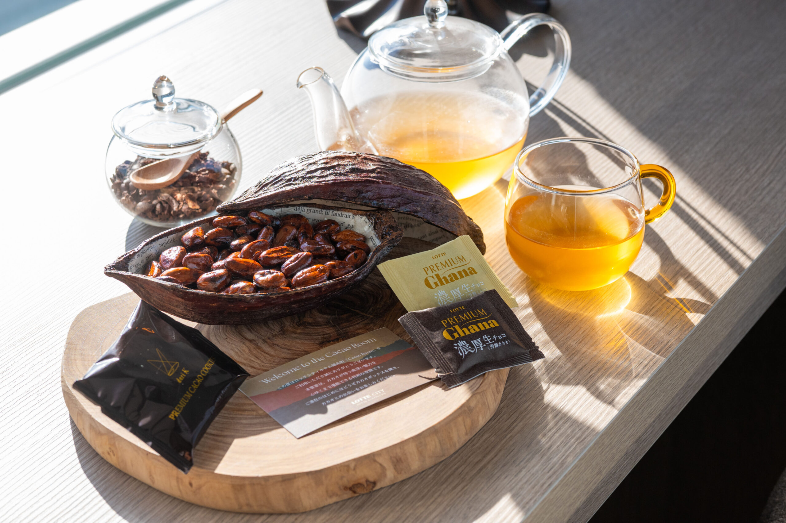 ・ウェルカムカカオスイーツ(スタッフが厳選したロッテグループのチョコレート)、カカオニブ使用カカオティー