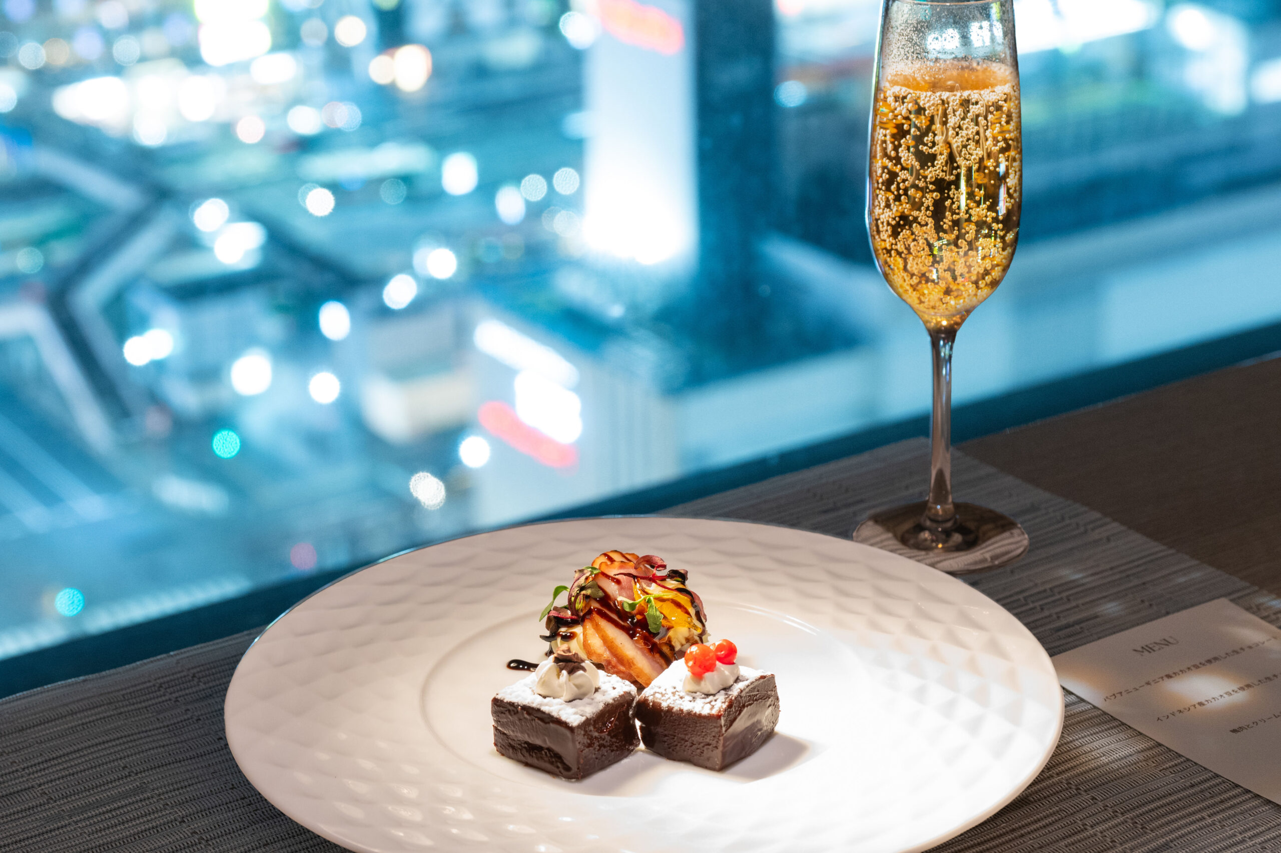 夜には、ホテル特製カカオプレートをお部屋にお届けいたします。2種の生チョコレートでは、それぞれ産地の異なるカカオを使用。カカオが持つ個性に触れる体験を楽しめます。窓いっぱいに広がる夜景を眺めながら、カカオの風味や味わいをご堪能ください。