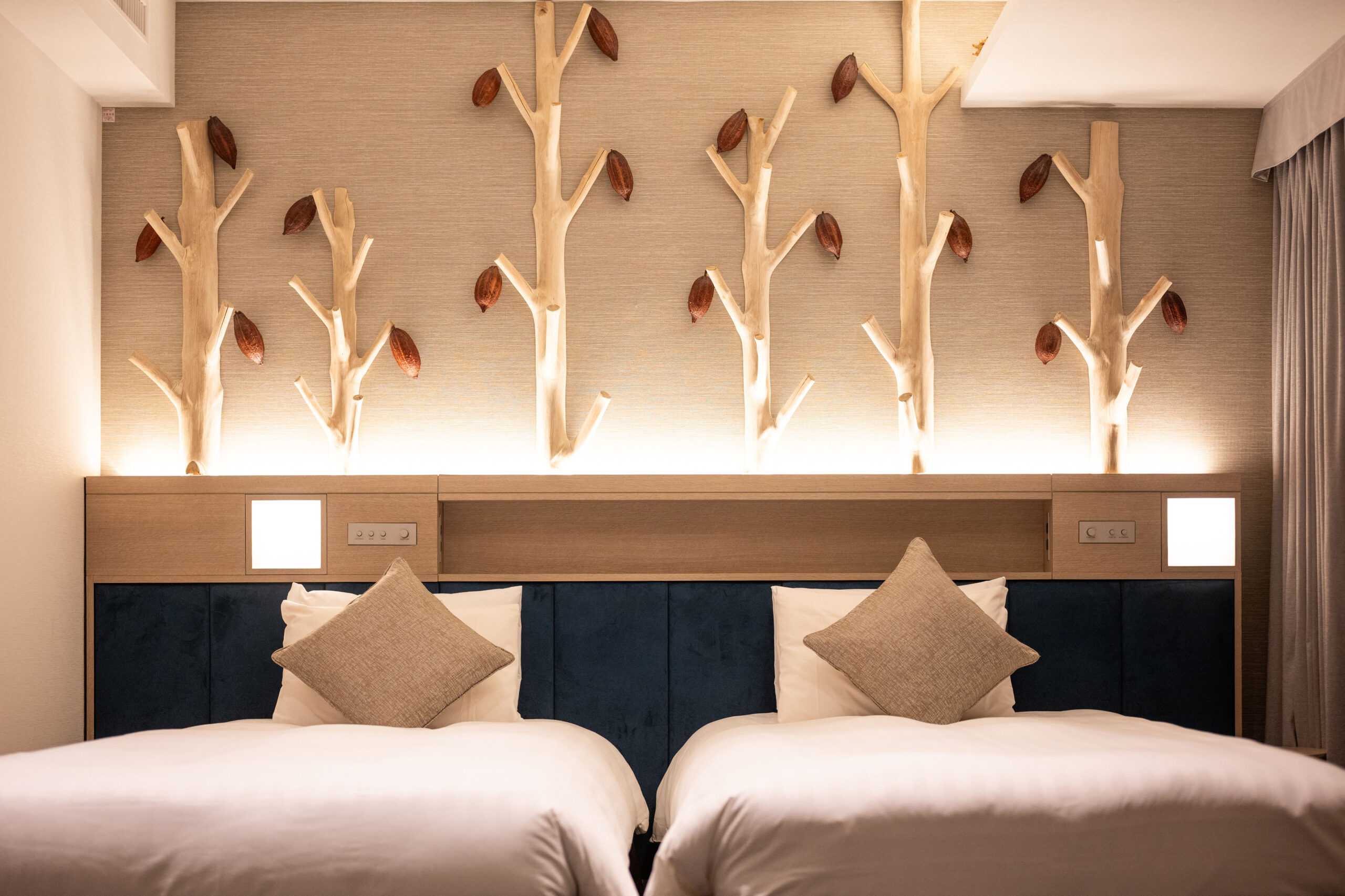 今回のCacao Roomでは、『植物と暮らす』がコンセプトの園芸店・株式会社ガレージの空間総合プロデュースによって、ドライカカオポッドをインテリアに生まれ変わらせました。ベッドボード上のドライカカオポッド装飾が、デラックスルームにアートの装いを纏わせたほか、「カカオポッドランプ」が光と影のハーモニーで客室をやさしく照らします。
