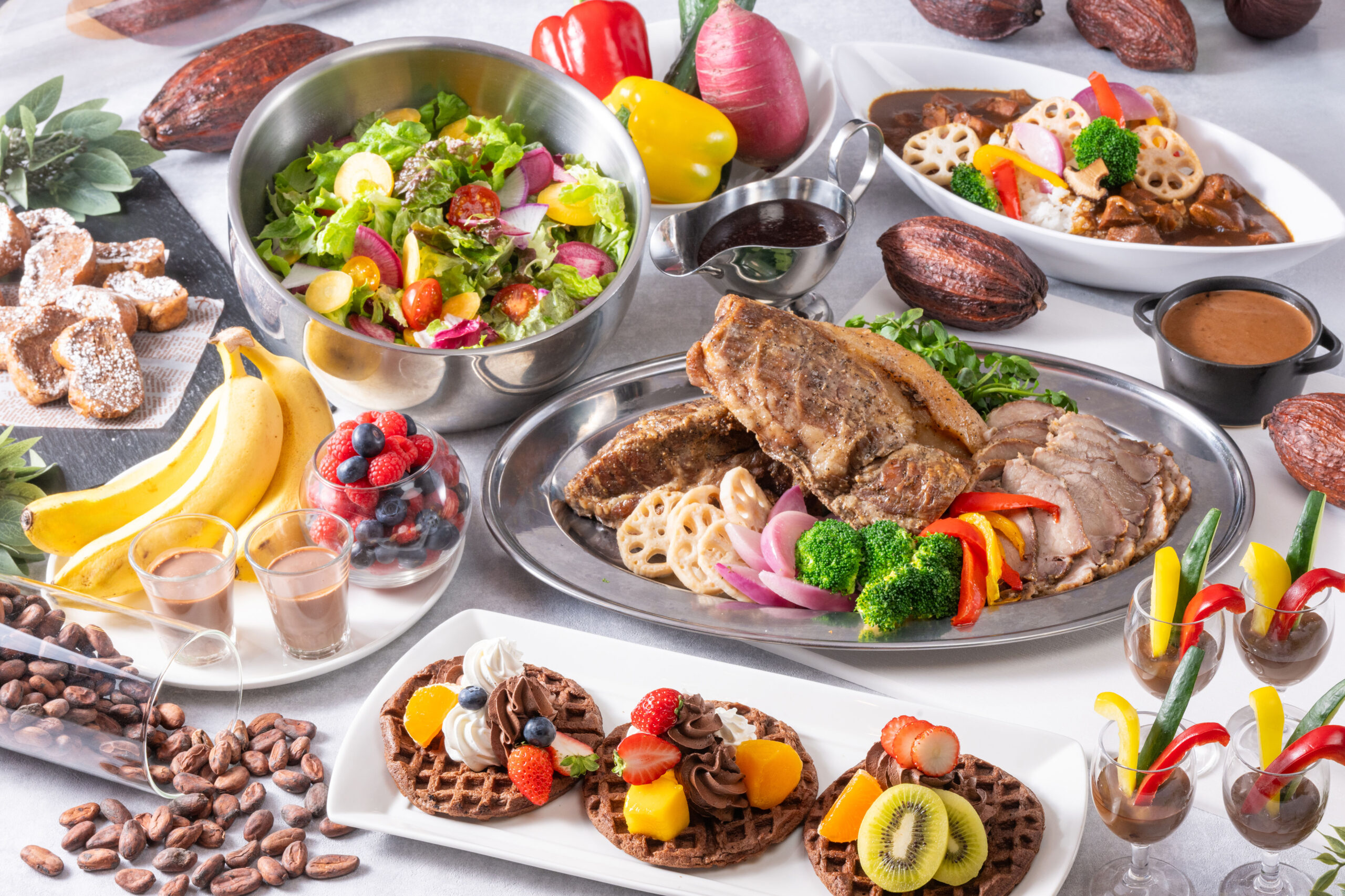 「ローストポーク モーレ ポブラーノ」「すりおろし野菜とカカオのドレッシング」「バーニャカウダ~カカオと江戸甘味噌のディップソース~」「カカオと3種ベリーのスムージー」「カカオフレンチトースト」といった期間限定特別メニューが登場。