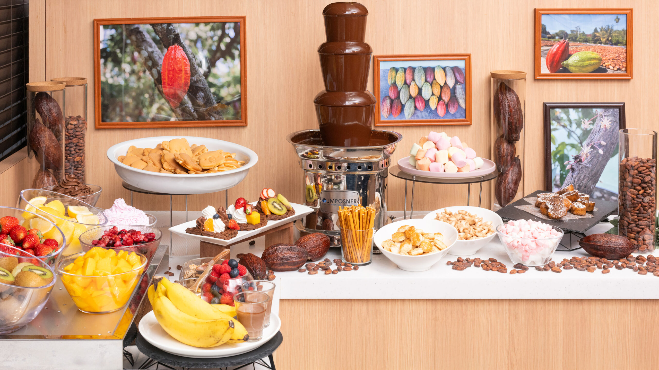お客さまご自身で焼きあげる「カカオワッフル」は、フルーツやチョコソース、マシュマロなどでお好みにアレンジし、オリジナルレシピをお楽しみいただけます。中身にチョコレートの入っていない「トッポ」「コアラのマーチ」「パイの実」もご用意しておりますので、可愛らしくアレンジするのもおすすめです。
