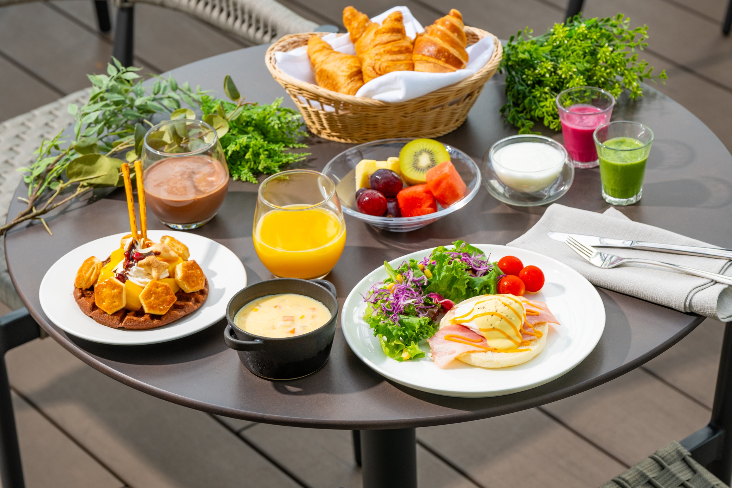 トレーニングと組み合わせて、健康と美を意識した朝食ビュッフェで栄養を補給するのがおすすめです。「エッグベネディクト」や「カカオ入りカレー」をはじめ、和洋のメニューや新鮮な野菜、フルーツをお楽しみいただけます。